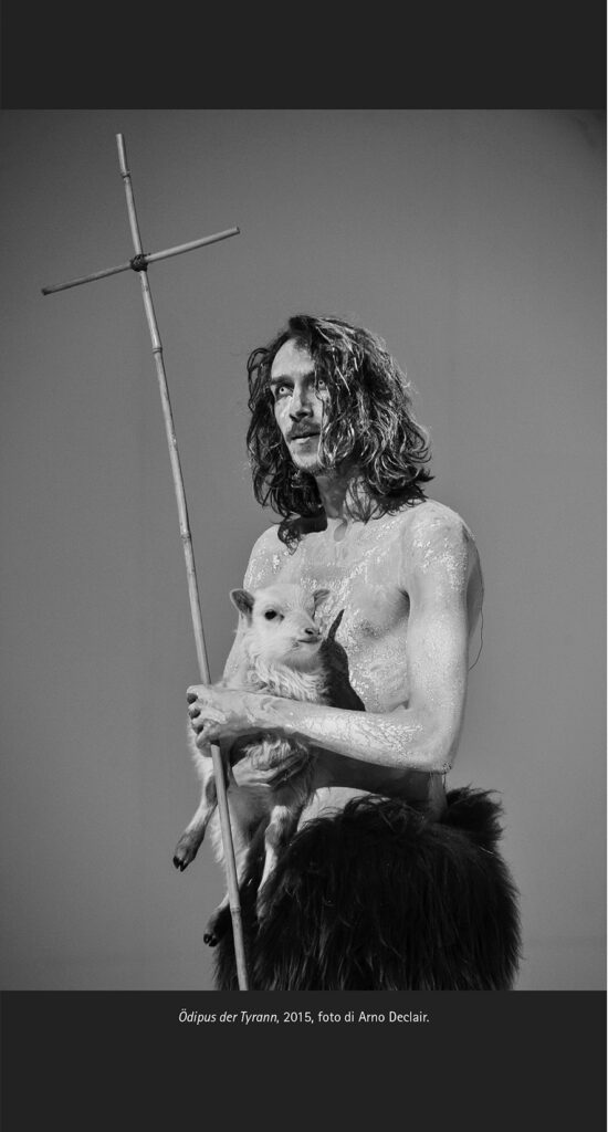 I. Prato 1995-Parigi 2015, II. Dal doppio alla polarità, III. Morfologia del mito sono interamente dedicati alla Societas Raffaello Sanzio e Romeo Castellucci. Per la compagnia cesenate, affacciatisi all’inizio degli anni Ottanta alla scena italiana, la tragedia e il tragico aprono una questione fondante, che è la stessa del teatro. La tragedia è per Romeo Castellucci la “stella polare” che orienta all’orizzonte, e non rispetto a uno sguardo retrospettivo, nostalgico ma gravido di futuro. Una questione mai pacifica né pacificata che viene analizzata nella messa in forma di tre opere, dove il confronto scontro con la tragedia greca è diretto e serrato: Orestea (una commedia organica?) da Eschilo (1995/2015); Ödipus der Tyrann da Sofocle/ Friedrich Hölderlin (2015); Tragedia Endogonidia (2002-2004). Sono tre opere che restituiscono tre modalità diverse di rapportarsi alla tragedia, e, in quanto tali non sono considerate nel rispetto del loro ordine cronologico di realizzazione, ma in osservanza piuttosto di un principio di senso che ne guida l’analisi.